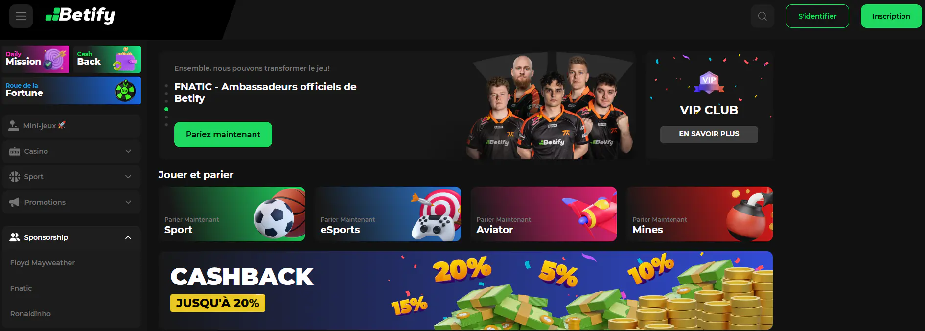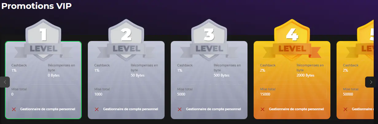 | Club VIP | Retraits rapides, cashbacks hebdomadaires, gestionnaire privée de compte, etc. |